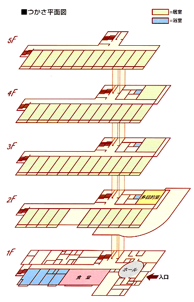 エレベーター1基、食堂、多目的室、相談室、自動販売機、男女大浴場、メールボックス、各階に洗濯室、談話コーナー、ユニットバス |